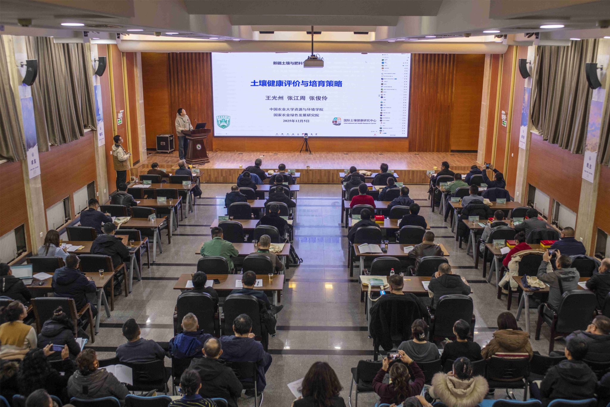 培训邀请国内知名高校、科研院所的9名专家授课。主旨报告环节,中国农业大学王光州副教授以《农田土壤健康评价与培育策略》为题,为学员们带来了一场前沿学术报告,介绍了土壤健康对于农业绿色发展的重要意义,阐述了当前土壤健康评价的问题、挑战与应对策略,为干旱区农业可持续发展提供了重要的研究思路。新疆生地所田长彦研究员作《新疆农业高产绿色发展的底层逻辑》报告,从国家粮食安全大背景引入,分析新疆农业的地理格局与生态环境,结合大量数据和实际案例,帮助学员深入了解新疆农业高产绿色发展的理论逻辑、实践逻辑。