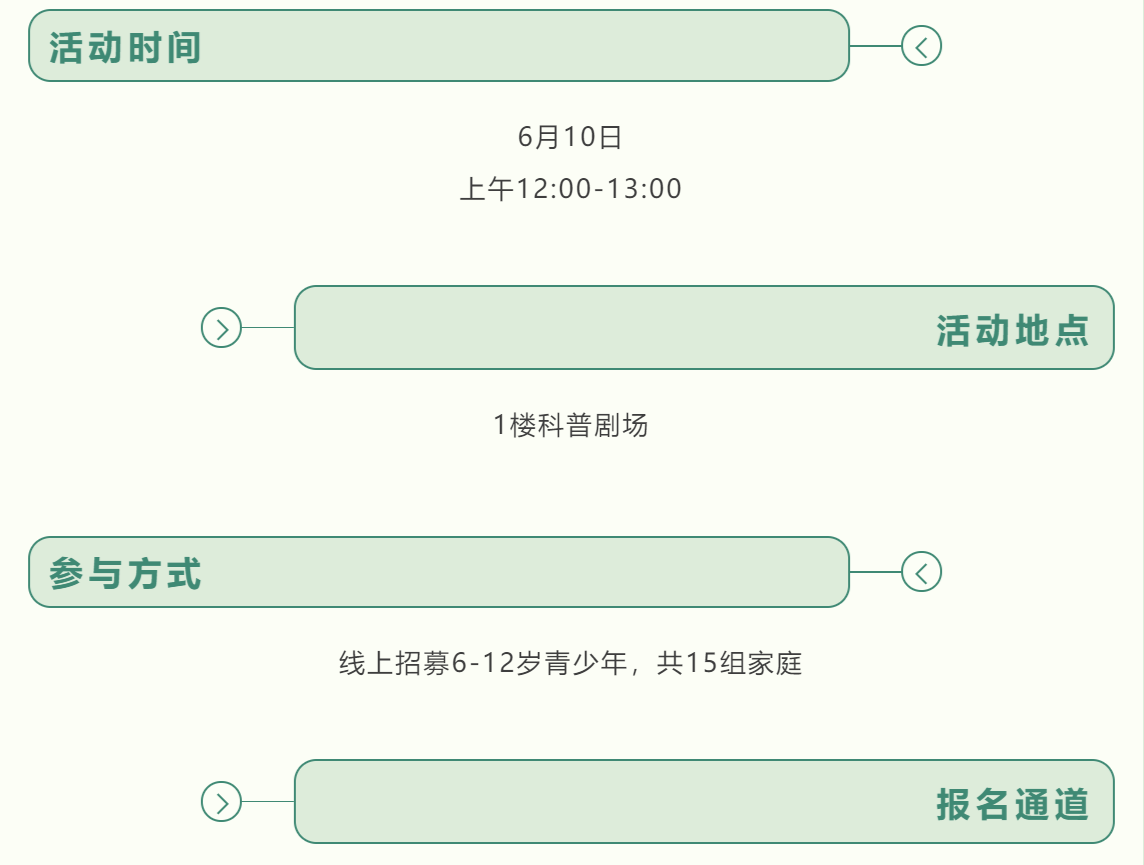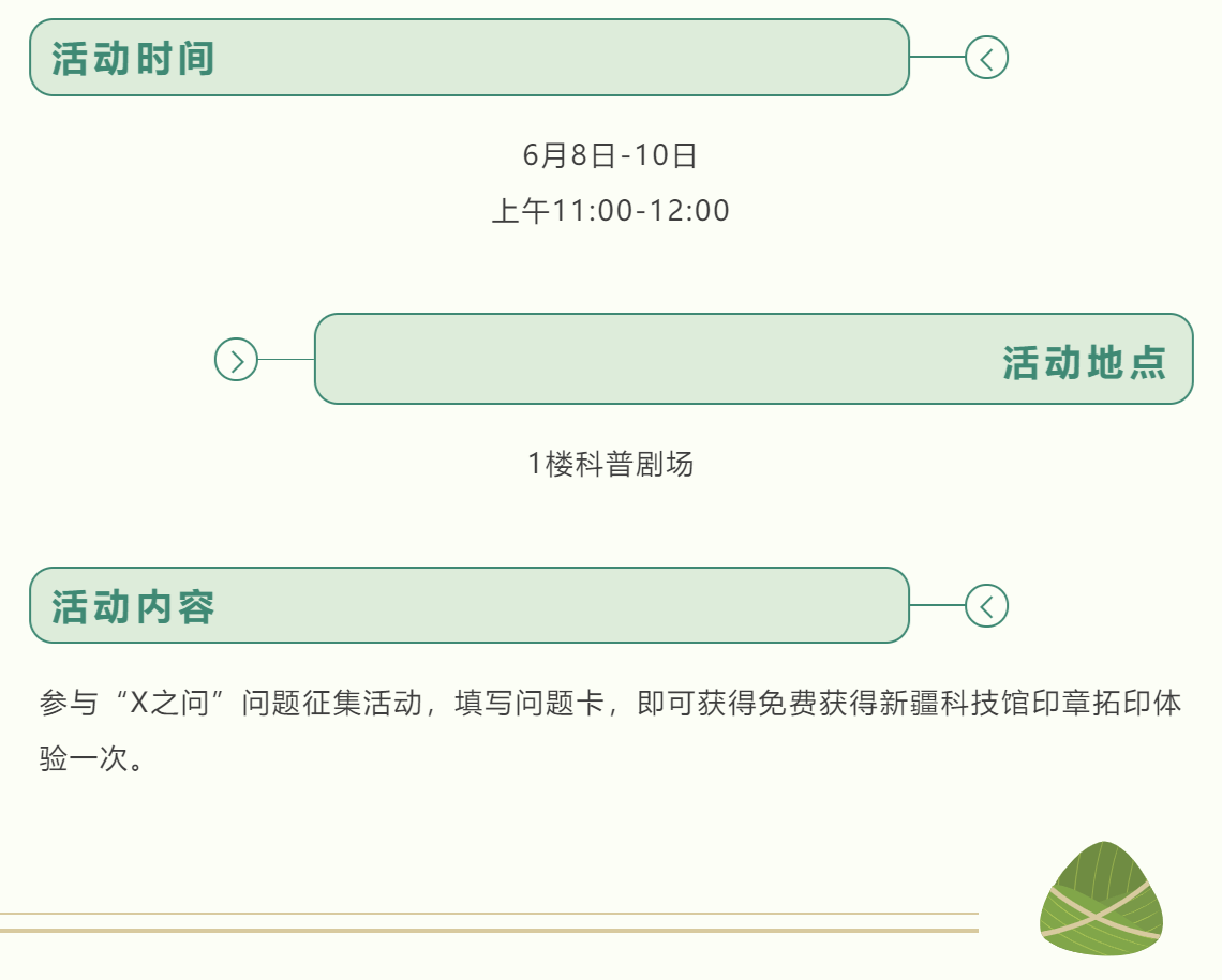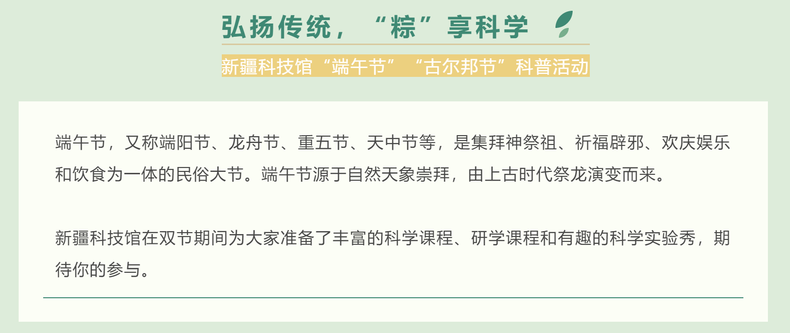 【活动】新疆科技馆“端午节”“古尔邦节”科普活动开始啦! 发布日期:2024-06-07 信息来源:新疆科技馆 阅读量: 扫描上方二维码即可报名报满即止扫描上方二维码即可报名报满即止扫描上方二维码即可报名报满即止扫描上方二维码即可报名报满即止扫描上方二维码即可报名报满即止 上一条:新疆科技馆闭馆公告 下一条:“端午节”“古尔邦节”开闭馆时间看这里
