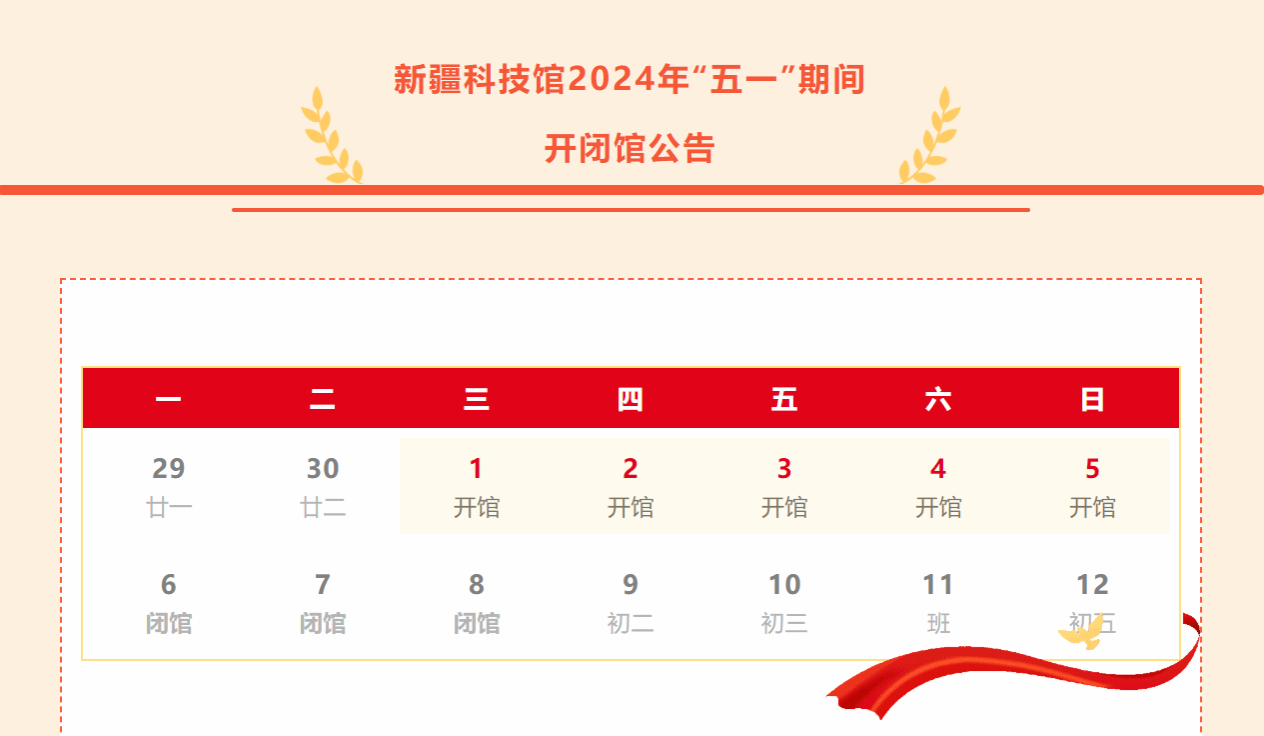 “五一”期间如何开馆?速看这里 发布日期:2024-04-29 信息来源:新疆科技馆 阅读量: 广大观众朋友:新疆科技馆2024年“五一”期间开闭馆公告如下:5月1日至5月5日开馆;5月6日至5月8日闭馆;5月9日起正常开馆。新疆科技馆全体员工祝您假期愉快。新疆科技馆全体工作人员竭诚为您服务。新疆科技馆2024年4月29日 上一条:【公告】参观必看 下一条:【活动】“劳动最光荣·青年创未来”新疆科技馆陪你乐享双节