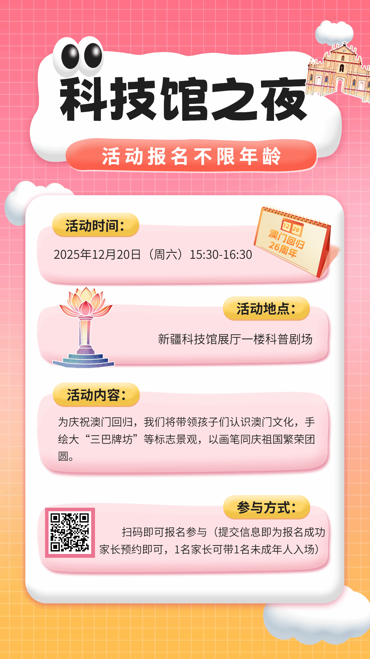 【招募】新疆科技馆邀您共绘盛世莲花·同庆澳门回归 发布日期:2025-12-19 信息来源:新疆科技馆 阅读量: 上一条:冬至饺香·智享科趣——新疆科技馆第二届饺乐大赛 下一条:科技馆作品征集活动来袭,邀您定格科技之美!