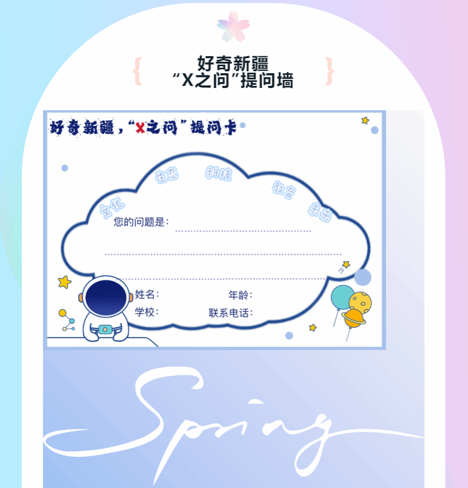 04、活动内容:在“X之问”卡片上填写你在文化、科技、生态、教育和未来等领域最关心的热点问题,后期将有专业的老师为你解答。