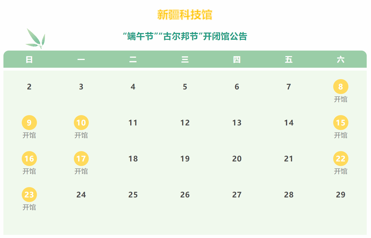 “端午节”“古尔邦节”开闭馆时间看这里 发布日期:2024-06-07 信息来源:新疆科技馆 阅读量: 广大观众朋友:新疆科技馆2024年“端午节”“古尔邦节”期间开闭馆公告如下: 端午节:6月8日至6月10日开馆,6月11日至6月13日闭馆;古尔邦节:6月15日至6月17日开馆,6月18日至21日闭馆,6月26日闭馆。新疆科技馆全体工作人员祝您节日愉快。新疆科技馆2024年6月7日 上一条:【活动】新疆科技馆“端午节”“古尔邦节”科普活动开始啦! 下一条:【活动】这个六一新疆科技馆陪小朋友们一起科技畅想,童心飞扬