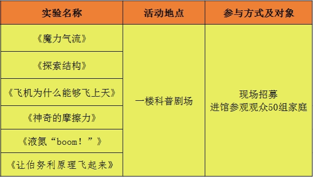4.活动内容:通过简单又有趣的科学小实验,引导观众全程参与,提出问题,思考问题,探索解决方法。让观众在活动过程中通过实践,学到科学知识,培养逻辑推理和归纳聚合能力。