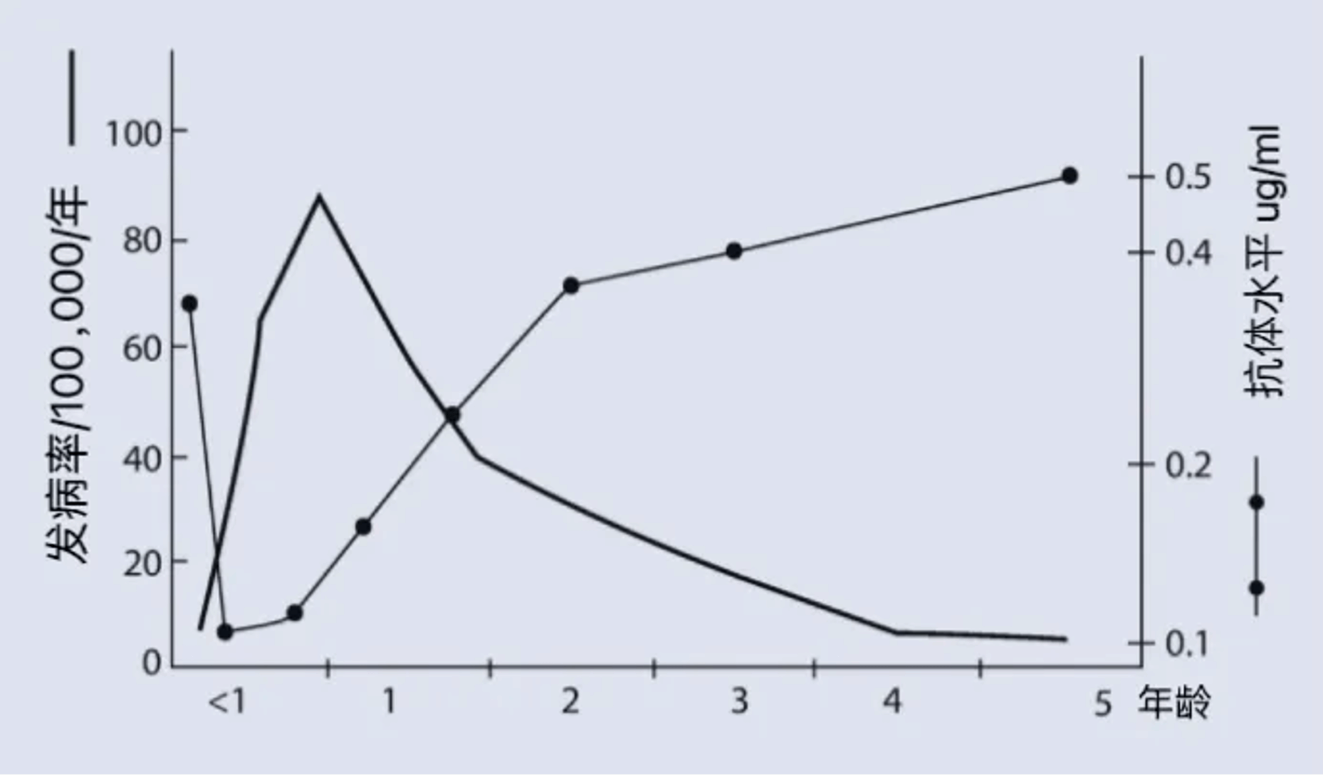 Hib 感染相关脑膜炎发病率和抗体水平与年龄的关系图片来源:参考文献[8]