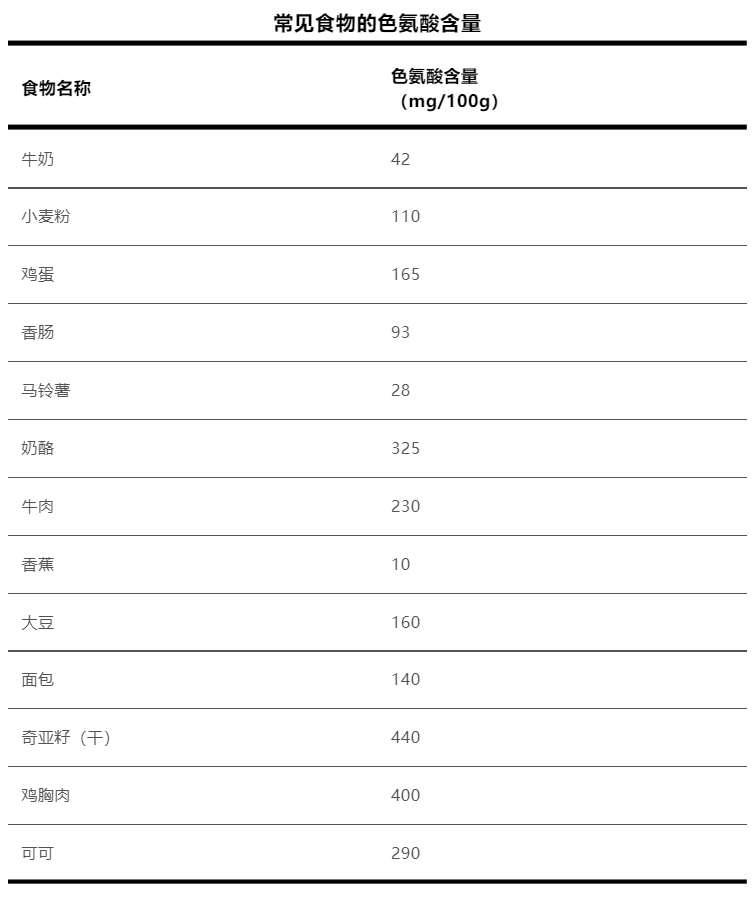色氨酸是一种必需氨基酸,人体不能自我合成,广泛存在蛋类、水果、蔬菜和种子等食物中,同时也是睡眠介质血清素(5-羟色胺)和褪黑素的前体。