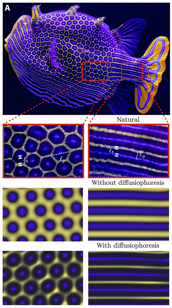 科罗拉多大学博尔德分校化学和生物工程师安库尔·古普塔 (Ankur Gupta) 和他当时的研究助理本·阿莱西奥 (Ben Alessio) 尝试在计算机图灵模型中模拟六边形图案时只产生了模糊的图案。它们与自然界产生的图案完全不同。但科学家们在一个称为扩散电泳(diffusiophoresis)的概念中找到了解决方案,即小分子推动或拉动大分子;这就是小小的肥皂分子在洗衣机中从衣服上搬出大块污垢的方式。当研究人员将扩散电泳添加到他们的模型中时,虽然它们仍然远非完美,但这些图案看起来更像箱鲀的鳞片了。