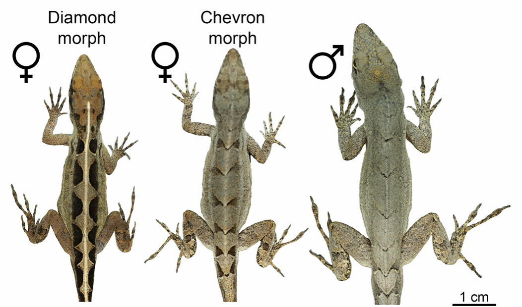 棕色雌性安乐蜥有菱形或人字形两种形态,但雄性安乐蜥总是带有人字形图案 CREDIT: N. FEINER ET AL / SCIENCE ADVANCES 2022