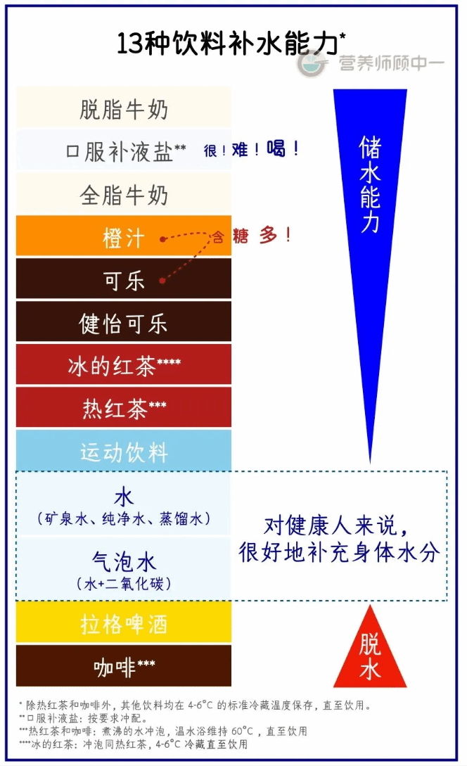 最解渴、“储水”最久的饮料分别是:脱脂牛奶、口服补液盐、全脂牛奶。
