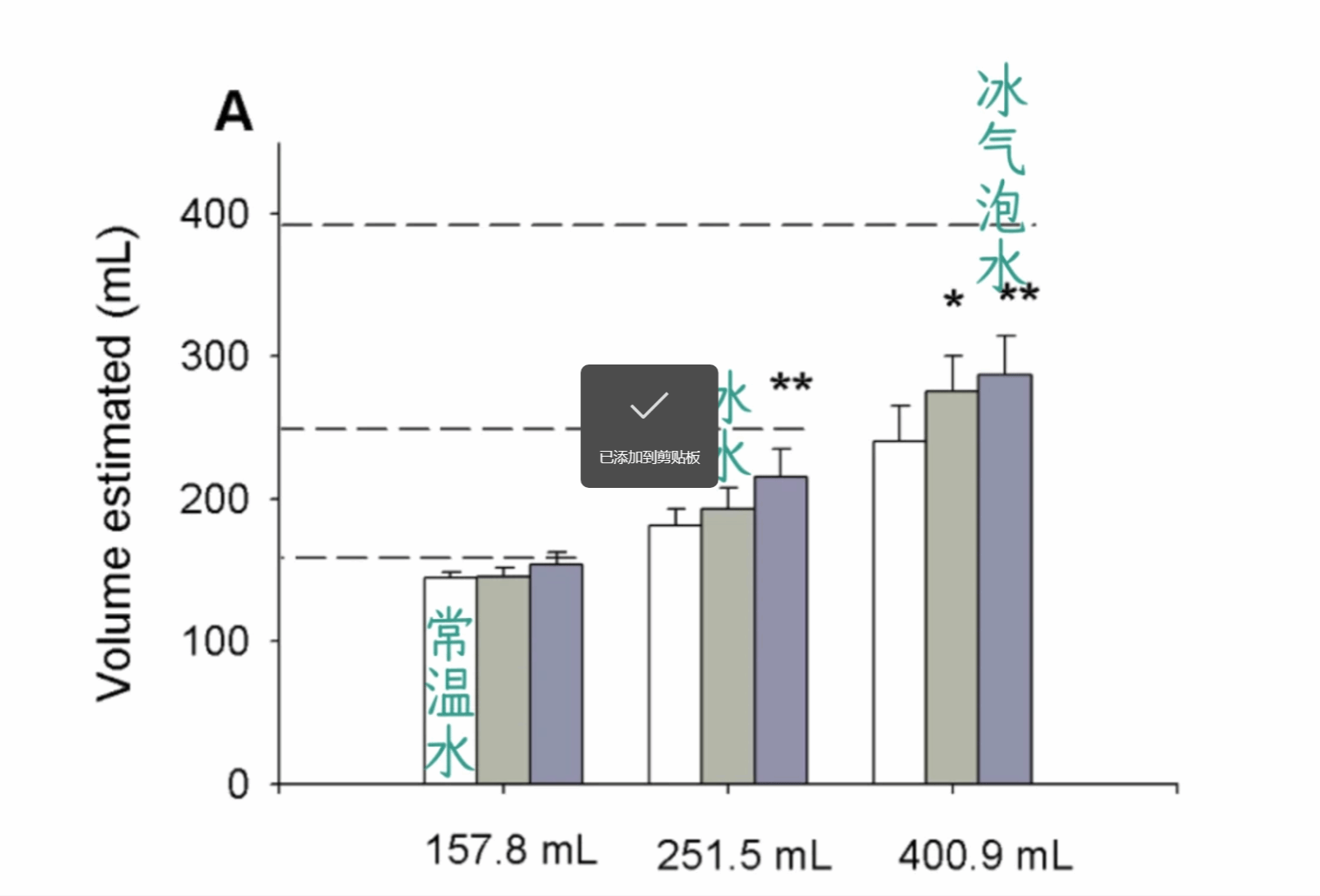 结果显示,先喝冰气泡水的人后续喝的常温水最少,其次是冰水,最后是常温水。这表明冰气泡水对缓解口渴的效果最好,其次是冰水,常温水最差。