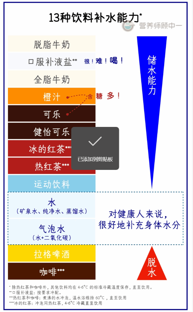 此外,水依然是最健康的饮料,建议大家定时定量喝水。不过如果运动后大量出汗,或有一段时间不方便喝水也不方便去卫生间时,可以考虑上面的三种解渴又“储水”的饮料。