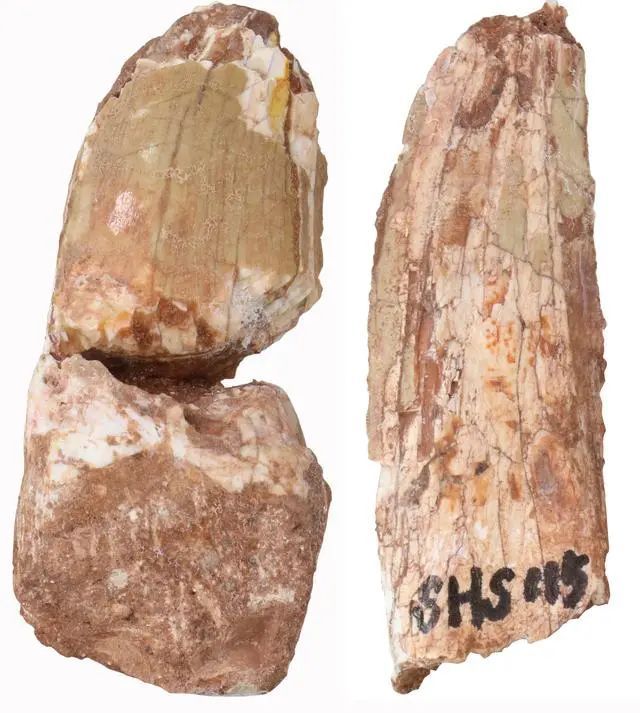 研究人员介绍,大部分兽脚类恐龙牙齿呈月牙状或香蕉状,中间宽并向两边收敛,收敛的末端形成隆突。此次发现的牙齿中有3枚发现于四会市,牙齿相对完整,牙冠长度均超过6厘米,另外一枚发现于广州市,为3.3厘米长的牙齿碎片。所有牙齿具有一致的形态特征,包括牙齿边缘有锯齿、锯齿密度较低、牙釉质光滑等,符合暴龙超科的牙齿特征。