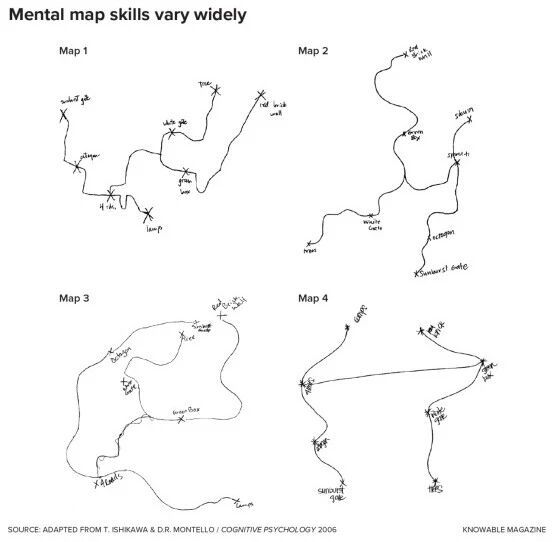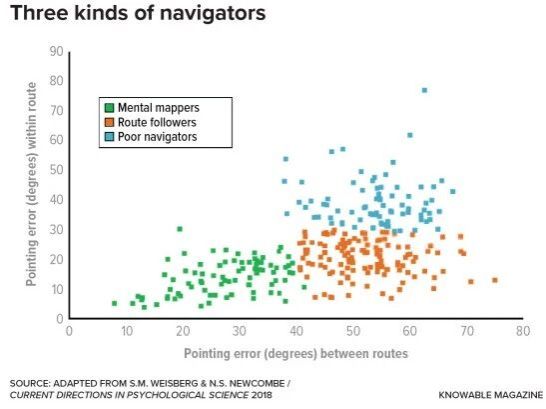 研究人员在 2018 年的《当前心理科学方向》(Current Directions in Psychological Science)杂志上报告说,人们分为三类。有些人已经形成了良好的心理地图:他们可以准确地指出相同路线和不同路线上的地标。另一些人对路线有很好的了解,但却很难绘制出完整的地图:他们擅长在一条路线内指出地标,但在不同路线之间指出地标的能力却很差。第三类人在所有的指向任务中都表现不佳。