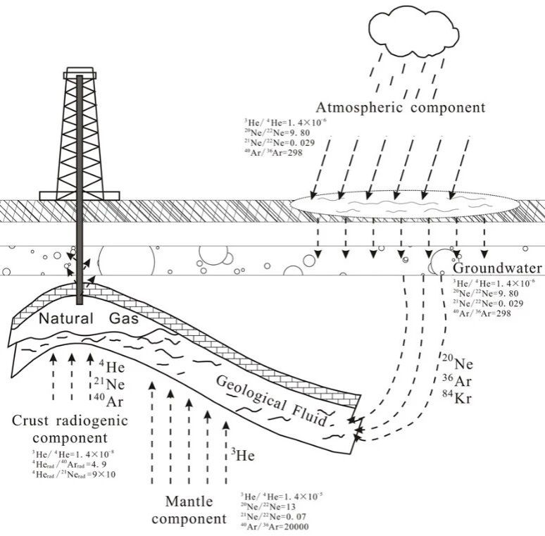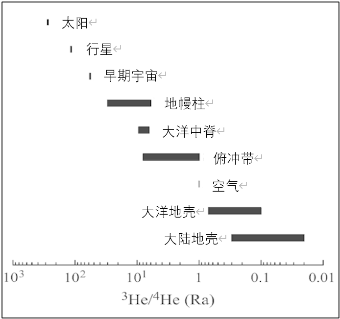 地壳中的氦同位素主要是由放射性元素的衰变过程产生的4He,其中最重要的放射性母体是铀和钍。由于地层中铀和钍元素的不均匀分布,导致地壳中不同地层的氦同位素比值并不相同。地壳中3He含量极少,3He与4He比值范围为0.02Ra~1Ra。