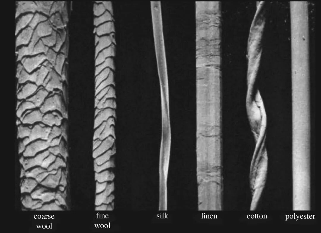不同纤维的扫描电子显微镜显微照片,依次为:粗羊毛、细羊毛、丝绸、亚麻、棉花、聚酯纤维,图片来源:参考文献 [5]