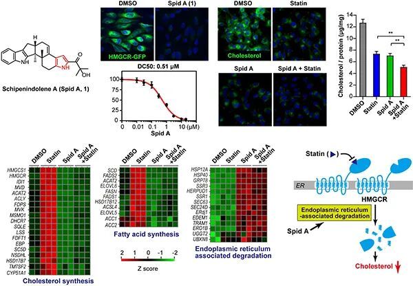 中国科学院昆明植物研究所重要类群植物化学及功能研究专题组长期致力于天然植物化学成分的结构与功能研究。从2020年起,该组重点选择了大果五味子,开启了对该科植物内生真菌的相关研究。大果五味子野外分布种群数量极少。专题组利用多级菌株筛选体系,从中寻找到一株极具代谢潜力的内生青霉菌。分子网络分析显示,该菌株是结构多样吲哚杂二萜的代谢宝库。通过系统研究,研究人员从中发现了涉及6种新颖骨架类型的8个吲哚杂二萜化合物。值得一提的是,由于分离所获得的样品量极少,研究人员通过创新方法,实现了该化合物的一步制备,为后续药理学研究奠定了重要基础。作为还原酶抑制药,他汀类药物是临床降脂治疗心脑血管疾病的“基石”,其通过抑制胆固醇合成的关键限速酶,实现降胆固醇的疗效。此前,昆明植物研究所研究员江世友揭示了他汀耐药和反弹机制,并提出了新的降解剂降胆固醇新理念,研发了首个关键限速酶降解剂。受他汀类药物源于微生物天然产物的启发,专题组与江世友团队合作,发现上述新颖吲哚杂二萜及其衍生物,具有关键限速酶的降解活性。其中Spid A活性最强,其降低细胞内胆固醇的活性与他汀类药物相当,与他汀联用后可进一步降低胆固醇,说明其具有单用、联用增强降胆固醇药效的前景。转录组和蛋白组分析还发现,Spid A具有减少他汀耐药和副作用的潜在活性和药理学优势,从而提供了新候选药物,也为心脑血管疾病治疗提供了新思路。