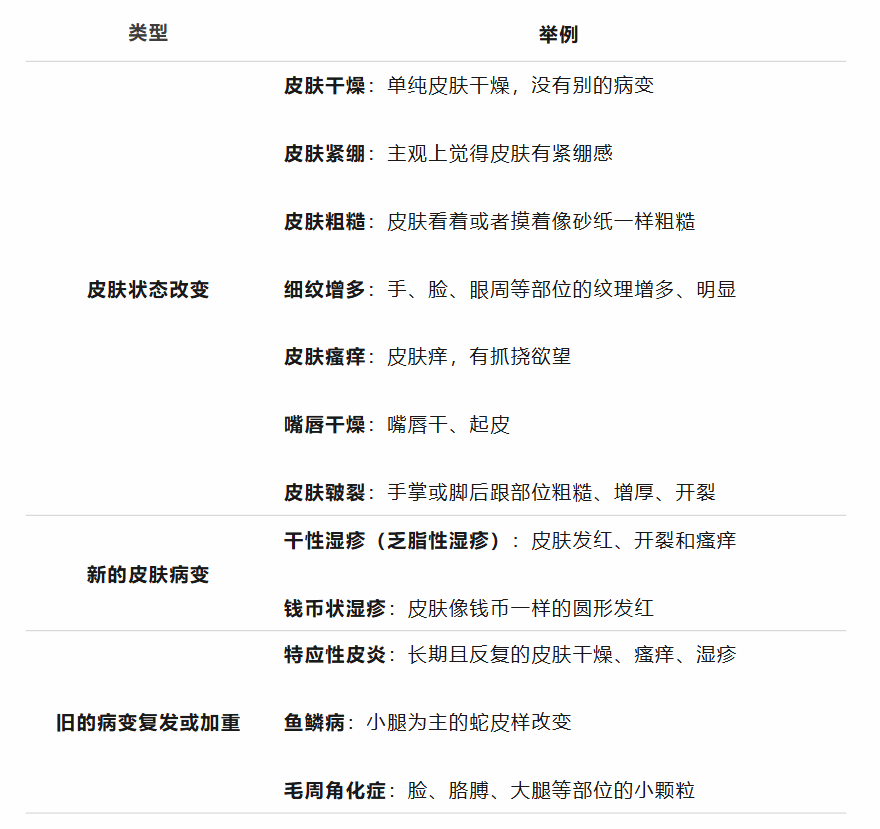 每个人适应气候变化的能力各有差异,当适应不了的时候,有的是洗脸后皮肤紧绷和干燥,有的是皮肤细纹增多,有的是皮肤瘙痒,有的是长新的湿疹,有的是原来的皮肤病复发或者加重。