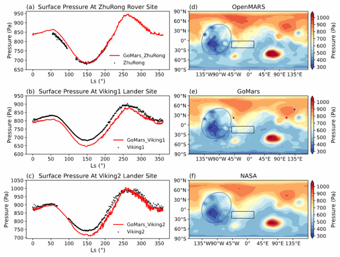 不同于地球,火星大气低压低温,水汽极少,沙尘变幻莫测。科研团队使用该模式模拟了火星大气环境中沙尘、水和二氧化碳三个关键气象元素的循环,并根据“天问一号”火星车“祝融号”和美国“维京1号”“维京2号”火星探测器的观测结果,以及国际火星大气全球数据集,对模式进行了性能验证。