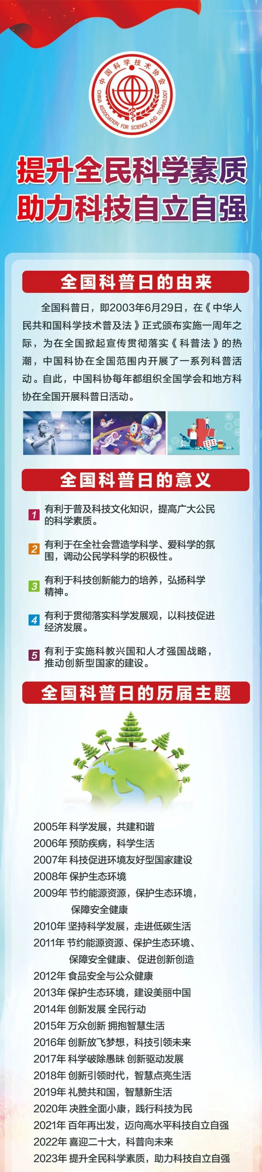 2002年6月29日,我国第一部科普法规 ——《中华人民共和国科学技术普及法》颁布实施,是提高中国公民科学素质的重要法律保障,为纪念科普领域这一里程碑性的日子,中国科协决定将每年的6月29日定为全国科普行动日,从2005年起,为便于广大群众、学生更好地参与活动,活动日期由原先的6月份改为每年9月第三个公休日,作为全国科普日活动集中开展的时间。