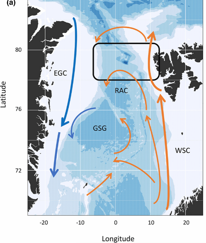 大西洋-北冰洋洋流系统图。其中橘色箭头代表温暖的大西洋洋流,蓝色箭头代表着寒冷的北冰洋洋流。黑色方框是莫尔腾的采样区域。来源:https://onlinelibrary.wiley.com/doi/10.1002/edn3.403