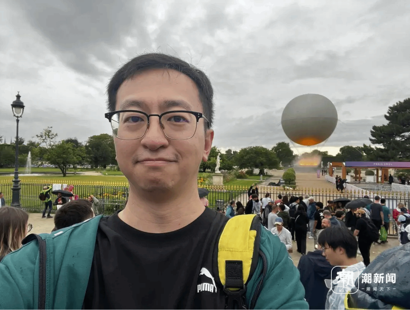 记者站在远处台阶上,在茫茫人群中与奥运主火炬台来了张自拍。