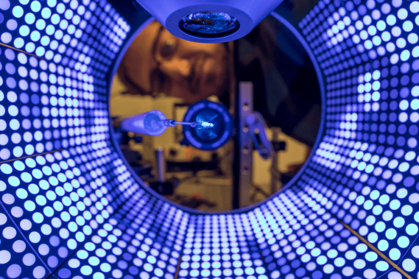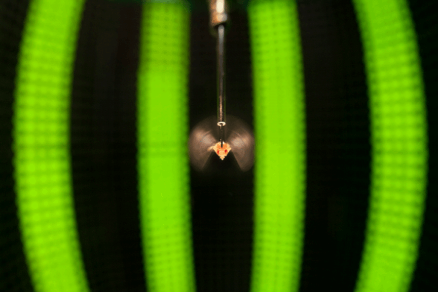 在用于研究飞行行为的实验装置中,图为从下方观察一只经过基因编辑的果蝇。果蝇被拴在LED照明的转鼓内。当果蝇拍动翅膀时,摄像机会记录下翅膀的振幅并分析出其为稳定视觉图案而尝试转动的方向。经过基因编辑的果蝇在身体被蓝光照射时,活跃的肌肉会发出荧光。科学家们能够看到果蝇在不同的飞行动作中使用了哪些肌肉。