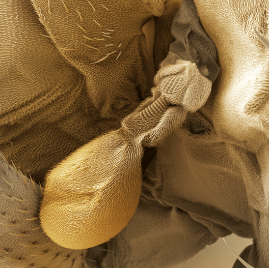 这张彩色的扫描电镜照片展示了雄性果蝇平衡棒的细节。