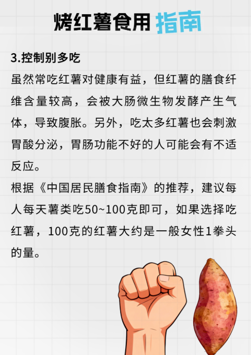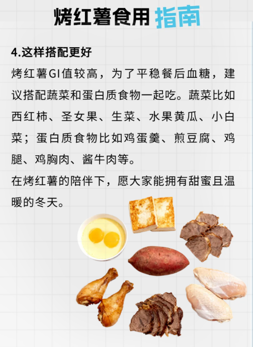 所以,对于有减肥和控血糖需求的人,不仅要少吃烤红薯,也最好别单独只吃烤红薯,搭配蔬菜和蛋白质食物一起吃,更有利于平稳餐后血糖。