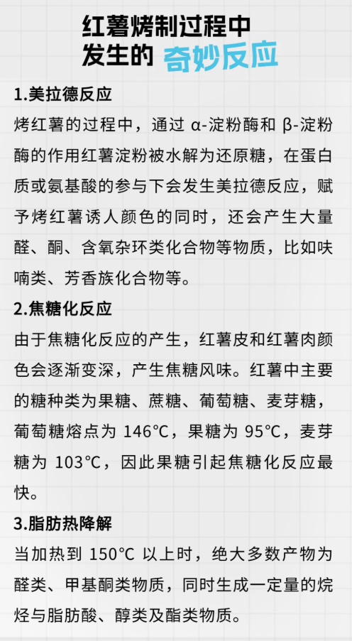这些化学变化产生的风味物质,对烤红薯香气的形成起到了重要作用。美拉德反应和焦糖化反应过程中,产生的杂环类香味成分含量所占比重较大,主要包括环戊烯酮类、呋喃类、吡喃类等,赋予烤红薯烤甜香、焦甜香等香味。