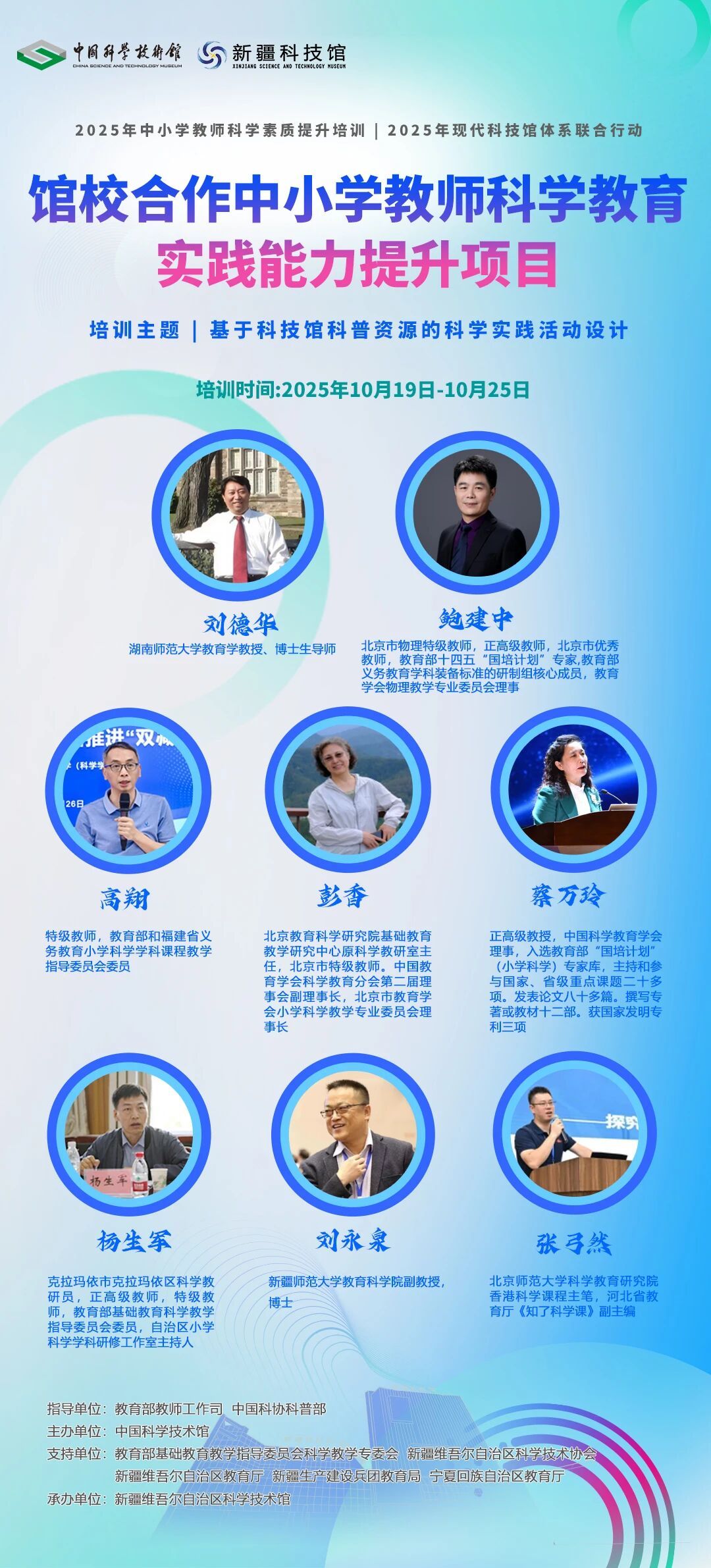 为深入贯彻习近平总书记关于科学教育的重要指示批示精神,推动校内外科学教育深度融合,进一步铸牢中华民族共同体意识,由中国科技馆主办、新疆科技馆承办的2025年现代科技馆体系联合行动“科学教师培训”系列活动“馆校合作中小学教师科学教育实践能力提升”项目,将于10月20日在新疆科技馆正式开班。