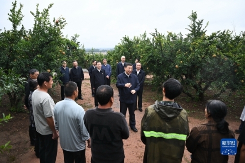 9月24日,中共中央总书记、国家主席、中央军委主席习近平在浙江考察结束返京途中,来到山东省枣庄市考察。这是习近平在位于峄城区的冠世榴园石榴种植园了解石榴产业发展情况。新华社记者燕雁摄