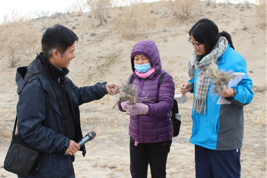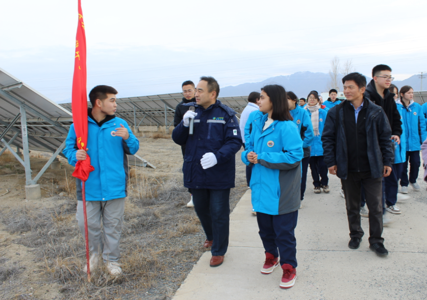 学校组织高一年级160名学生走进精河县赛马场附近的风沙地貌和精河县浙江能源光伏电厂,开启了一场精彩的地理研学活动。从课堂到实践,从书本到实地触摸,使学生们现场感受因长期风力作用而产生的风沙地貌,学习光伏发电的原理。梭梭、沙棘、红柳、沙蒿等植被、光伏发电的技术激发了学生们的好奇心和想象力。“大家都知道,风沙地貌沙子多,水分少,梭梭在这里的生长,全凭借顽强的生命力,只要一点水分,就能够在2-3小时内发芽,梭梭能适应沙漠综合治理难度严苛的环境;什么叫光伏建筑一体化以及太阳能光伏发电的优点……”地理老师张红玉和杨师傅正在为同学们认真地答疑解惑。