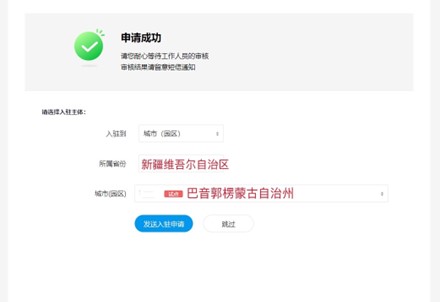 7.提交认证申请跳转至申请页面,申请页面中城市(园区)选择巴音郭楞蒙古自治州即可。