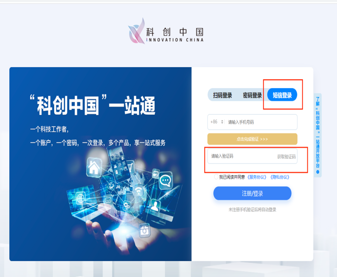 3.进入注册登录页面后,点击短信登录,填写短信验证码进行登录。