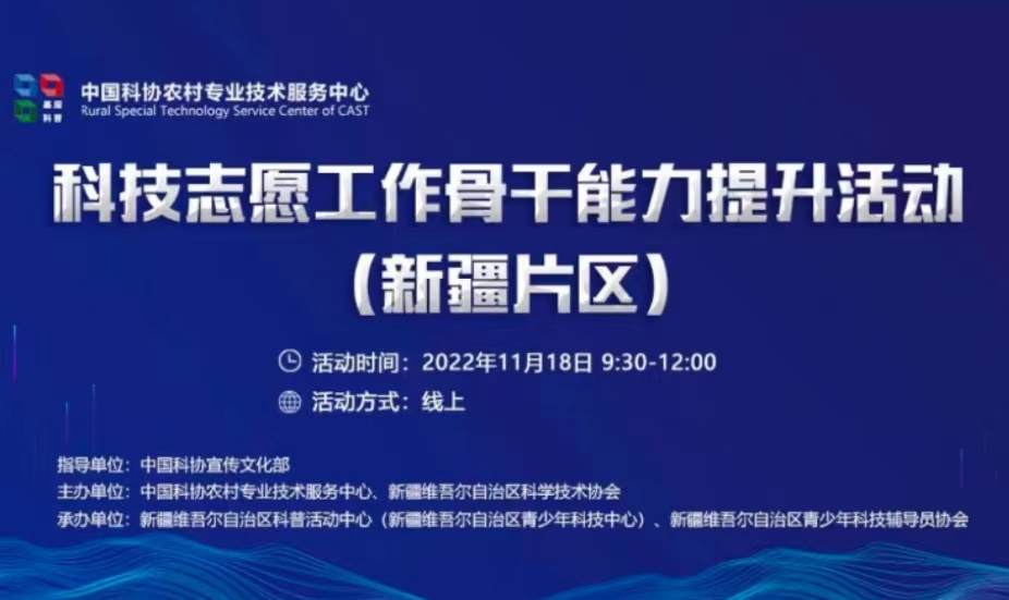 2022年11月18日,由中国科协农村专业技术服务中心、新疆维吾尔自治区科学技术协会科协主办的科技志愿工作骨干能力提升活动(新疆片区)以线上观看的方式举办。旨在进一步提高全区科技志愿服务效能,提升科技志愿者尤其是科技志愿工作骨干能力和水平。