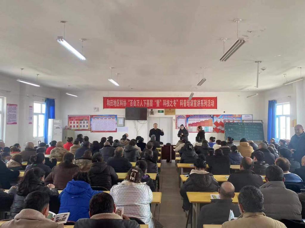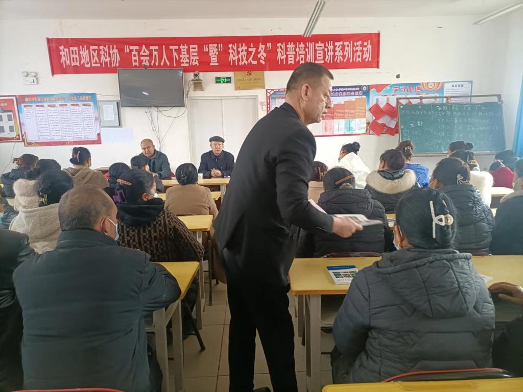2023年2月7日,和田地区科协、和田老科协、和田县科协领导一行6人,前往和田县阿瓦提乡开展“科技之冬”科学养殖技术科普培训活动。切实引导农牧民群众掌握实用科学技术,为农业增效、农牧民增收奠定良好基础。和田老科协畜牧专家买买提敏·阿卜杜拉给村民进行授课,课程采取专题讲座与实地讲座、现场互动等方式进行,为当地230余名村民及养殖户送上一份畜牧科普大餐。