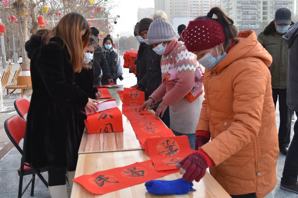 活动现场,5位书法志愿者凝神聚气,隶、楷、草、行各显神韵。“国富民强万物盛,人和家兴百业昌”、“春归大地人间暖、福降神州喜临门”,一幅幅包含祝福的春联,一张张火红的福字,带着浓浓祝福摆满了整个活动现场。围观者凝神屏息,静静感受着书法艺术的魅力,活动现场被芳香的墨汁和喜庆的年味环绕,经久不散。