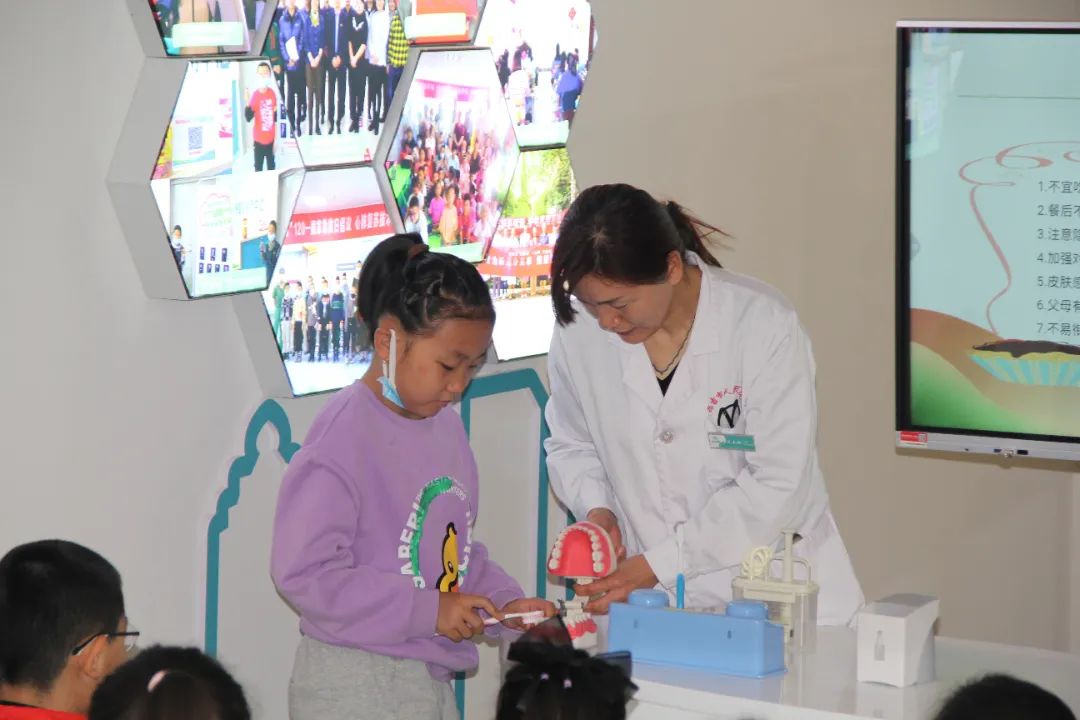 “小朋友每天刷几次牙?”“你们是怎样刷牙的?”口腔医学科副主任吕大梅根据实物讲解了如何正确刷牙,随着提出的一个个互动的小问题,孩子们积极回答问题,现场瞬时热闹了起来。吕主任手把手教同学们正确的刷牙方法,并且强调刷牙时间至少要保证3分钟。