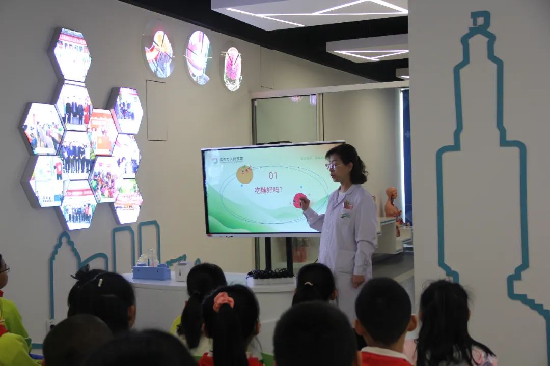 儿科主任杨艳丽为孩子们讲解了小孩子为什么不能多吃糖,提醒孩子们过量吃糖,容易引起蛀牙、肥胖、消化不良、视力下降,建议小朋友们吃糖要有节制,同时,要注意及时刷牙、漱口。