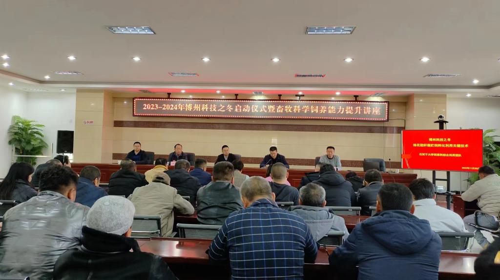 11月28日,博州“科技之冬”启动仪式在温泉县畜牧局会议室举行。博州科协主席梁文明、新疆生产建设兵团第五师科协主席甫·巴特尔、石河子大学动物科技学院党委副书记郭玉堂、王新峰教授、蒋松副教授以及新疆纵海佳慧饲料加工有限公司总经理高惠出席启动仪式。新疆生产建设兵团第五师88团、温泉县养殖大户及温泉县各乡镇(场)畜牧兽医站技术人员和温泉县相关单位人员参加启动仪式。