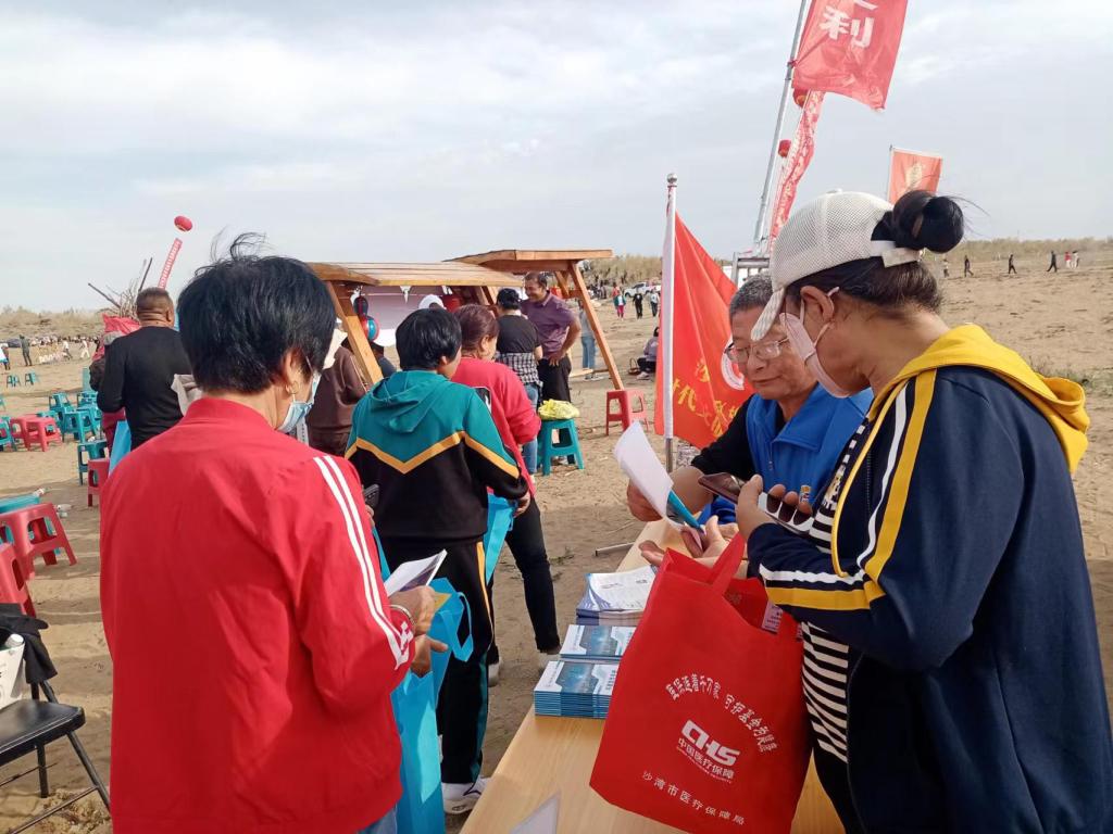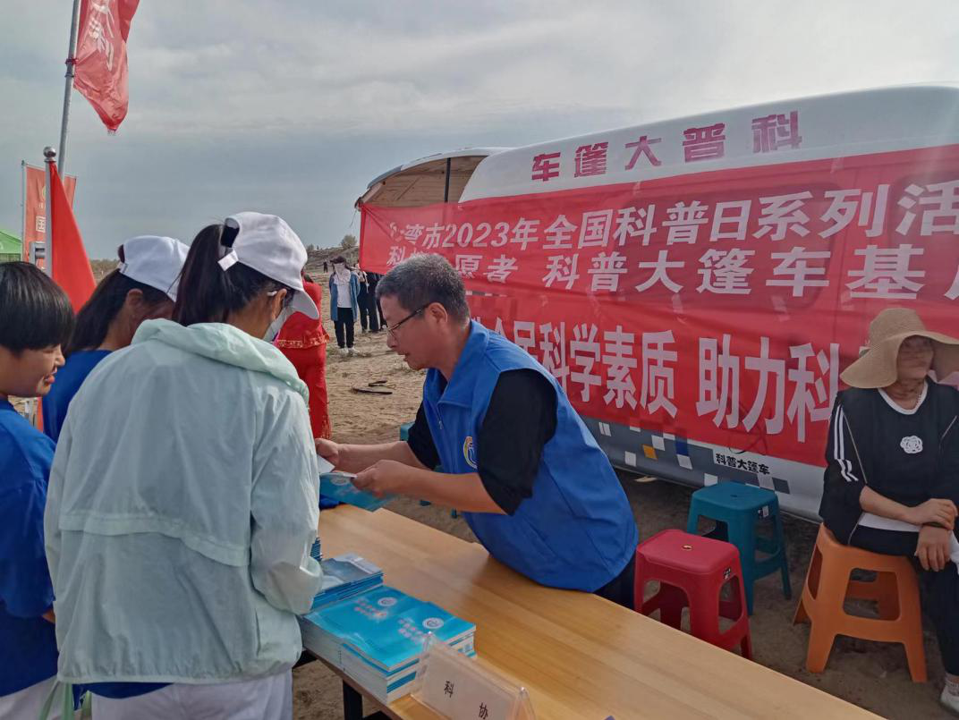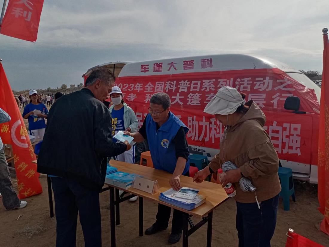 9月20日,在老沙湾镇农民丰收节——沙漠音乐会之际,沙湾市科协科技工作者驾驶科普大篷车前往老沙湾镇古尔班通古特沙漠进行科普宣传活动,与老沙湾周边的游客与村民近千人共享丰收喜悦。