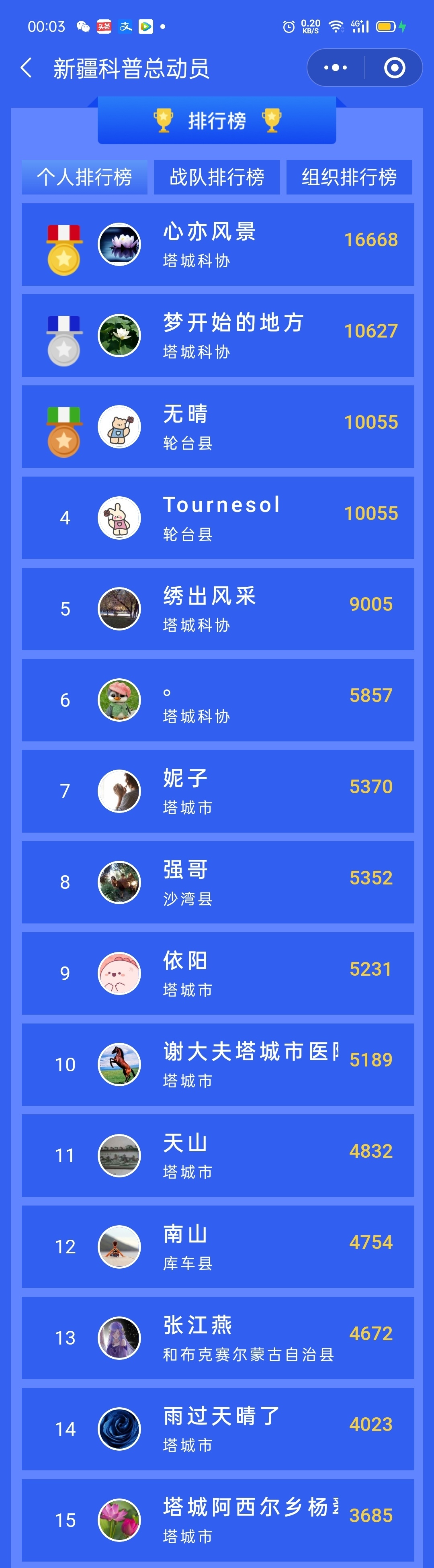 近日,自治区科协联合新疆生产建设兵团科协联合发文,公布了2022年新疆全民科学素质网络知识竞赛结果,据统计,参加本次科学素质网络知识竞赛的答题人数近35万人,个人答题累计502万余次,双人对战答题累积51万余次。塔城市在竞赛活动中表现突出,喜获佳绩!本次全民科学素质网络知识竞赛中,在全市干部群众的共同努力下,塔城市年度总积分达296399分,在全疆县市中位列第二,其中个人总排行榜中前15名中,就有6名是塔城市的参与者。