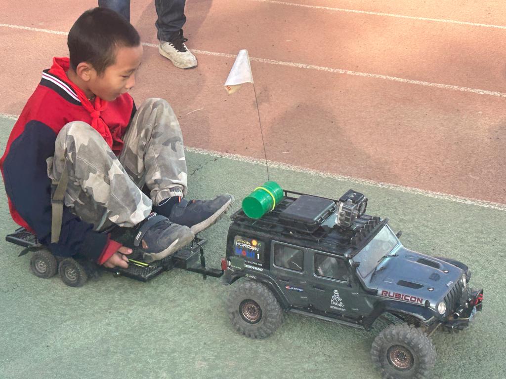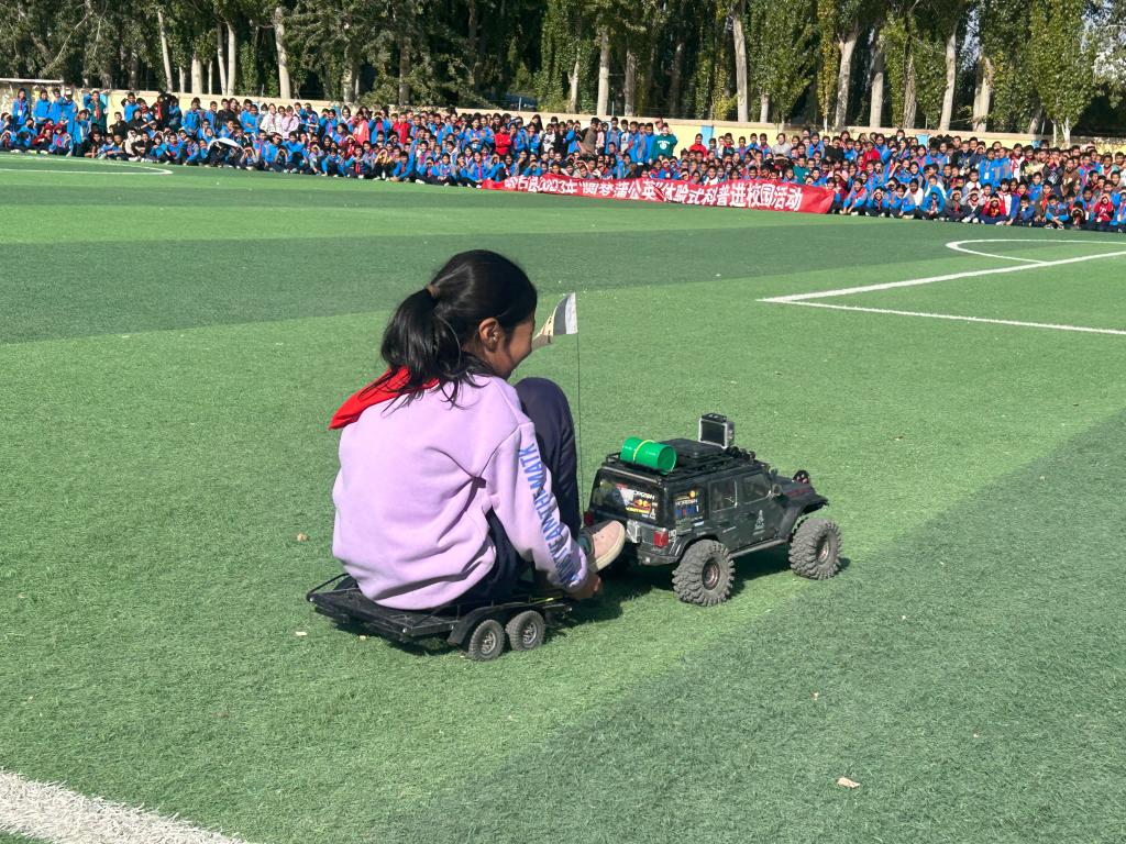 活动现场,最先映入眼帘的是满载“高科技”的科普大篷车和整整齐齐摆在操场上的各种航模、车模和巴州科协“应急安全”主题流动科普巡展展品。活动特邀请巴州遥控模型运动协会飞行教练张佰战老师,带领两名科技辅导员和科技小先锋,为大家展示了全地形越野大脚车、牧马人攀爬车、苏27战斗机模型等各种车模和航模、各种高难度动作,让学校操场成了欢乐的海洋。不同机型的航模在天空上不停地翻转、悬停、倒飞、喷着彩烟;会跳舞的机器人随着音乐翩翩起舞……孩子们看着从未见过的科普展教具,新奇不已、欢呼雀跃,处处充满了欢声笑语。他们边参观边兴奋地体验科技的神奇,切身体会科技的魅力,场面热闹非凡。
