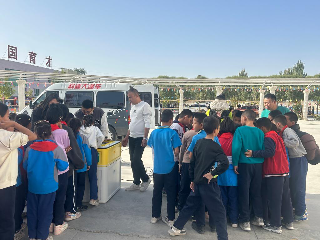 晚秋时节,尽管空气中伴随着寒风,仍抵挡不住孩子们对科技的期待和热情。每到一处,学生们已早早在操场上排着队,拉着横幅等待“科技盛宴”的到来。