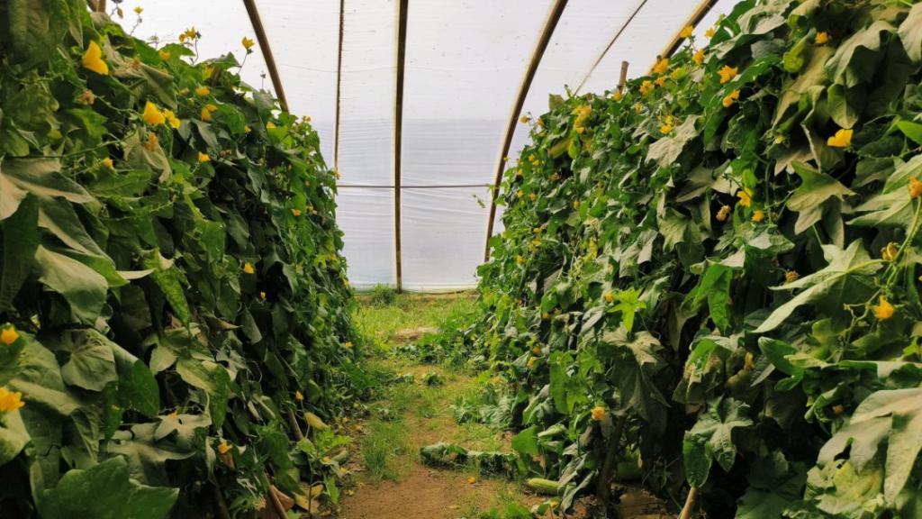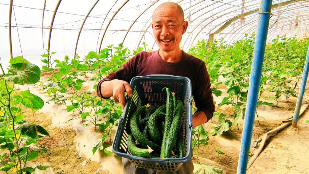 在刘海深的蔬菜大棚,满眼葱绿。一根根绿色的吊绳上盘绕着丝瓜茎蔓。刘海深时不时弯腰查看一下植株的根部、苗叶的长势。