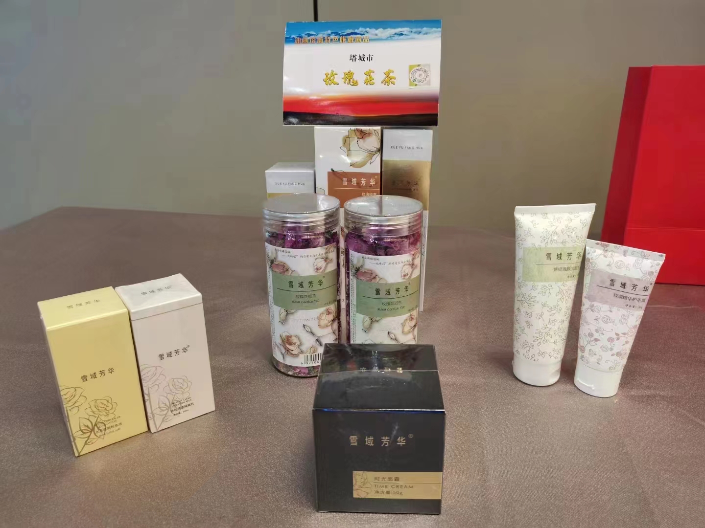 推介会上,塔城地区精心挑选塔城市雪域芳华玫瑰、塔塔尔族传统糕点、俄罗斯族冰淇淋、塔城风干肉、哈萨克族奶疙瘩、沙湾大盘鸡、裕民县巴什拜羔羊肉、乌苏柳花茶等40余种特色产品参展,吸引了不少中外客商观看、咨询和采购。其中,塔城市科协科普示范基地——塔城市恒翌生物科技开发有限公司(雪域芳华玫瑰基地)作为塔城市代表参加此次推介会。此次参展商品主要包括:玫瑰花茶、玫瑰花酱、玫瑰纯露、玫瑰精油、玫瑰精华乳、玫瑰精华霜、玫瑰精油护手霜、眼霜、洗面奶等系列玫瑰产品。