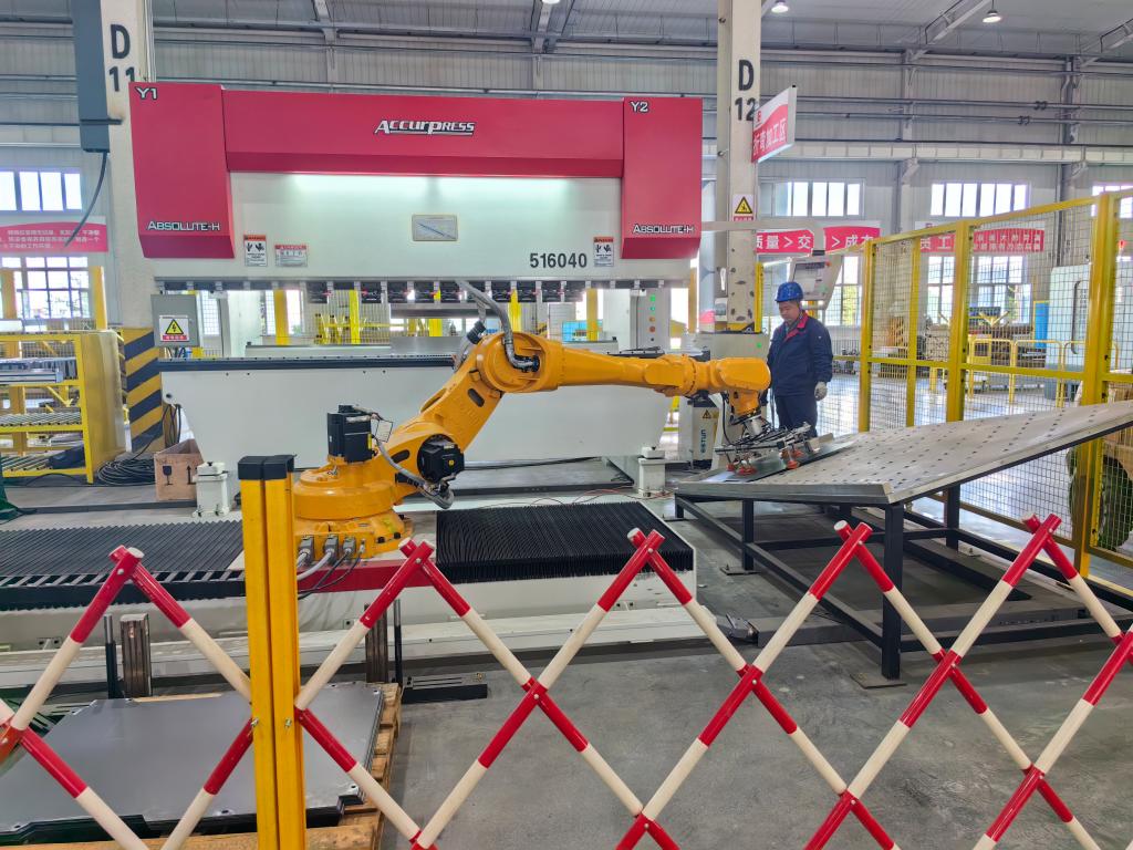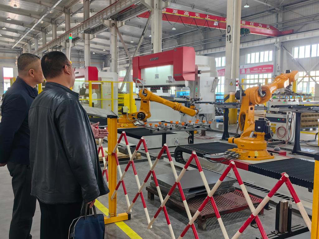 5月5日,新疆钵施然农业机械科技有限公司零件压冲工段,多台机械臂正在对采棉机需要的产品进行全自动生产。