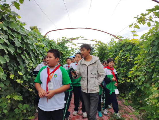 一路走一路看,学生们还观摩了树莓、酿酒葡萄、西瓜等植物,通过亲手采摘、品尝等,体验劳动的快乐。