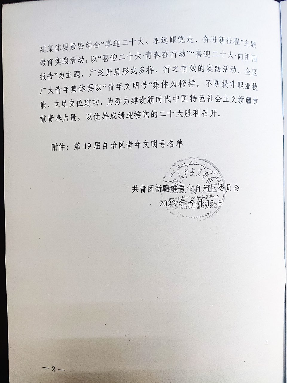 根据共青团新疆维吾尔自治区委员会《关于命名第19届自治区青年文明号的决定》(新团发【2022】 2号),新疆科技馆展览中心荣获“第19届自治区青年文明号”荣誉称号。
