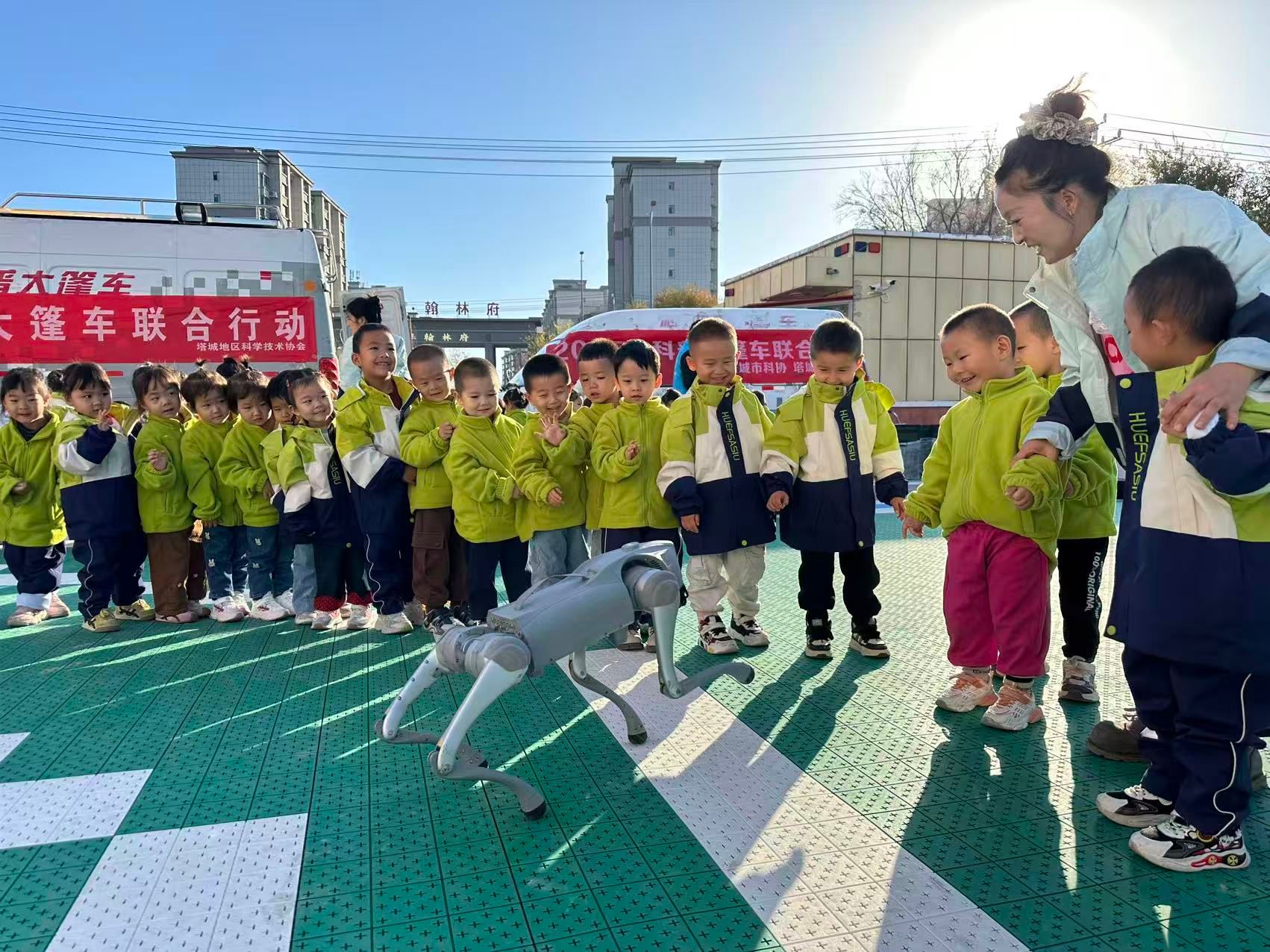 活动开始,机器狗表演瞬间吸引了孩子们的目光。灵活的机械四肢、精准的动作指令,引得孩子们阵阵惊叹。大家纷纷围上前去,近距离观察机器狗的构造,踊跃向科普志愿者提问,探究机器狗背后的人工智能与机械原理。紧接着,机器人闪亮登场,它们整齐划一地舞动着机械手臂,伴随着欢快的音乐节奏,为孩子们带来了一场精彩的舞蹈表演,将现场气氛推向了高潮。此外,拼图玩具和益智棋类也吸引孩子们踊跃参与。他们在动手拼搭中锻炼空间思维,在棋类对弈中学习策略与合作,现场气氛热烈。