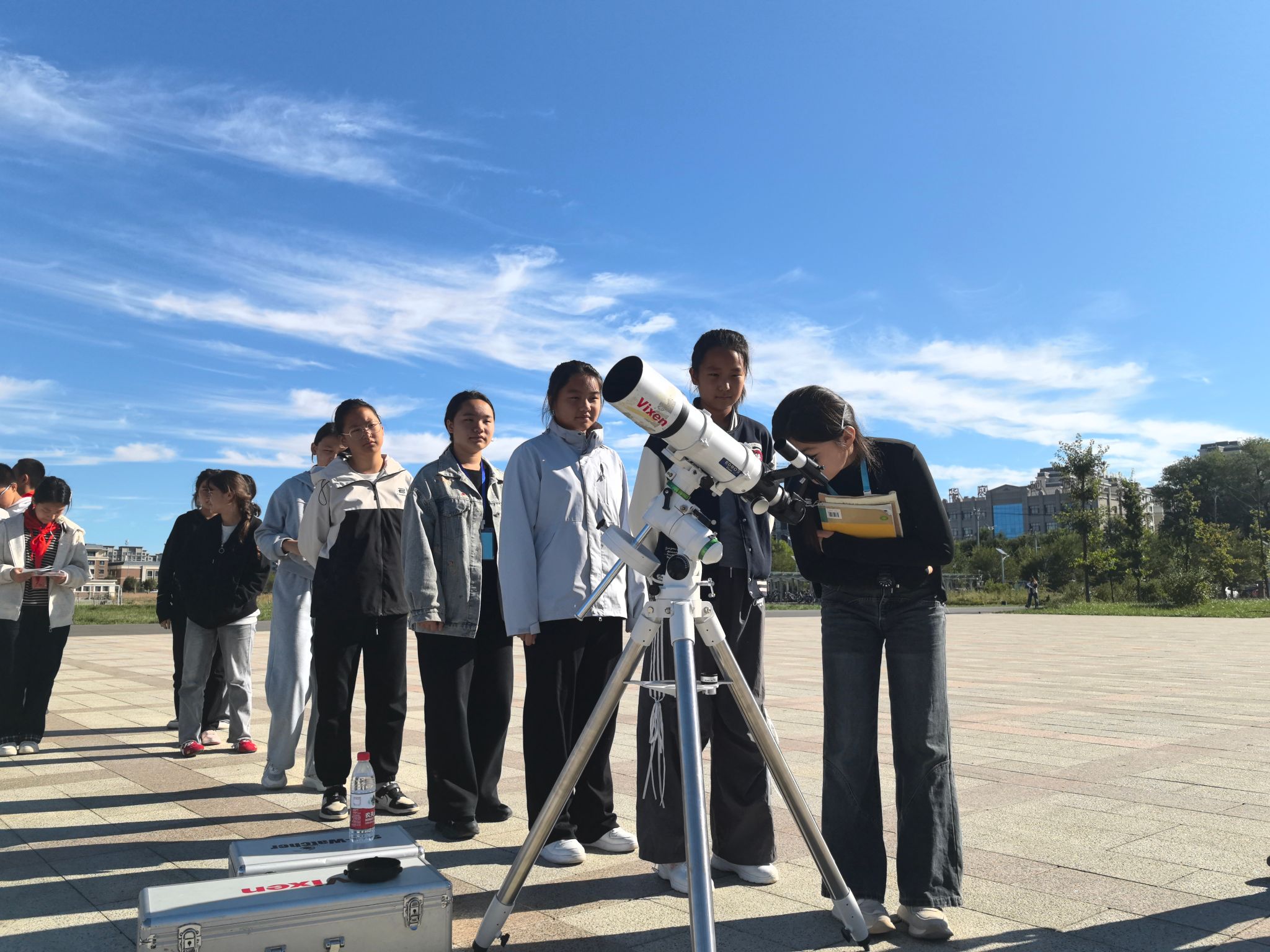 实操体验环节更是让活动氛围达到高潮。专家们带来的专业观测设备深受同学们的喜爱。在塔城市第四小学的操场上,科技工作者手把手指导学生操作天文望远镜,调整焦距、对准天体,当孩子们通过镜头清晰看到太阳黑子的轮廓、月球表面的环形山时,兴奋地互相分享观测发现。“原来月亮上的‘坑’这么大!”“太阳上真的有黑色的斑点!”稚嫩的惊叹声中,科学的种子悄然种下。